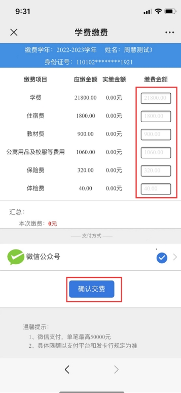 如支付过程遇到问题请回到学费缴费,查看账单,并继续支付。缴费成功后会提示扣款成功,可以看到缴费信息。微信支付,单笔最高50000元,具体限额以发卡行规定为准。