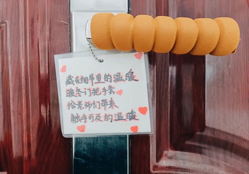 岁末年关,寒冬已至。冬季的金属门把手是大家不可避免的“劲敌”,在触及金属质地的门把手时,透心的凉意在手心绽开,偶尔还会伴有静电,让大家措不及防。为了有效解决这一问题,商学院给教室的门把手穿上了“新衣”,让同学们在出入开门时不用再为冻手和静电而发愁。