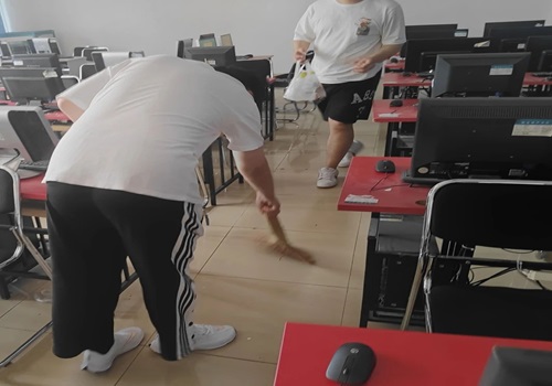 尽管烈日炎炎,但路边的杨树却为辛勤劳动的同学们遮阴。在活动期间,同学们在学生会负责同学和各班级班长的指导下,分工合作,有条不紊地将楼前路边和楼内教室进行无死角打扫。同学们弯下腰,俯下身,不放过一片污渍,在同学们的相互配合下,此次劳动教育圆满结束。