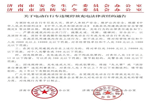 2024年2月26日,济南市安全生产委员会办公室、济南市消防安全委员会办公室发布了《关于电动自行车违规停放充电法律责任的通告》。校园是师生生活的重要场所,人员密集,电动自行车存放量大,存在一定的安全隐患,让我们一起来学习这个通告,共建安全校园吧!