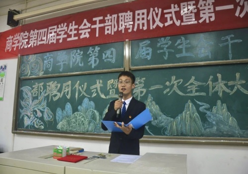 为进一步加强学生干部队伍建设,提升学生干部的整体素质,进一步推动商学院发展,10月10日下午5点商学院在诚明楼第三多媒体教室召开了商学院第四届学生会干部聘用仪式暨第一次全体大会,商学院副院长郭小凡、学管科副科长刘因科、团总支书记李敏、学管干事隋敏以及各辅导员老师和全体学生会成员出席本次会议,会议由商学院秘书长张芷若主持。