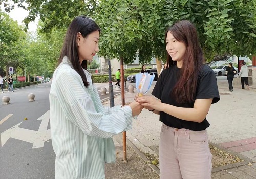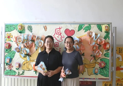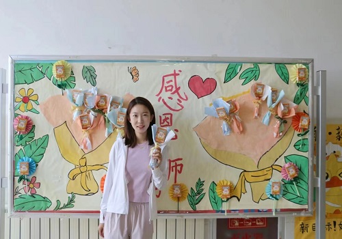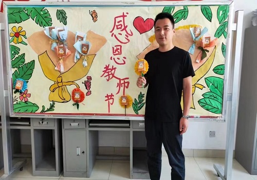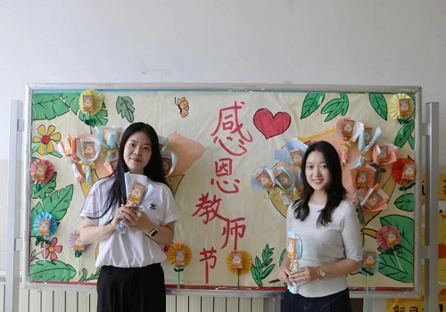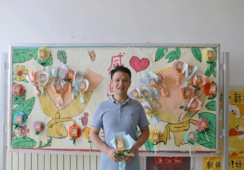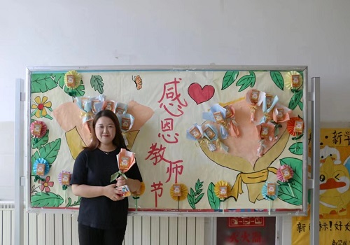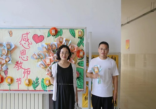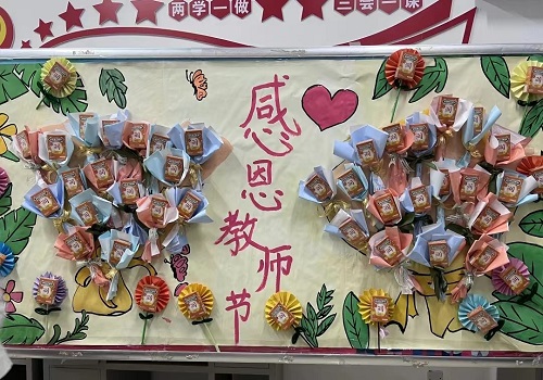 同学们满怀敬意地将板报上的润喉糖花束递给老师,脸上露出灿烂的笑容。老师的手中拿着花束,脸上也洋溢着幸福的笑容,我们也将他们的温馨时刻记录下来啦!这些花束都代表着学生对老师的敬爱,教学楼里到处都是浓浓的师生情!