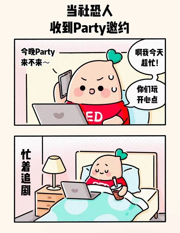 社恐原本指心理学中的“社交恐惧症”。在这一症状下,个人过分和不合理地惧怕外界的人以及社交情境,产生明显的焦虑、惊惧和自主神经症状。相对于心理学的定义,许多给自己贴上“社恐”标签的年轻人,往往是表明自己不擅长与人交往或踏足需要展示自己的社交场合,害怕尴尬,更习惯于私密圈子或独处,在社交时会感受到压力并且表现得比较紧张。