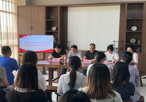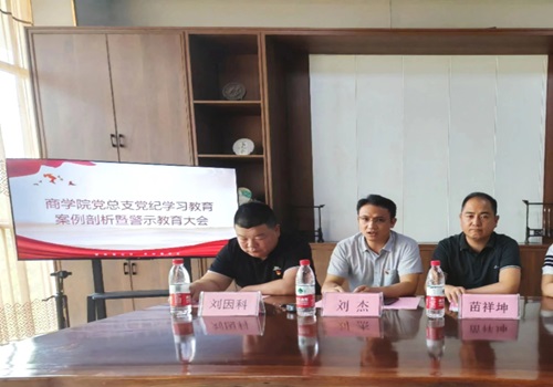 为进一步推动党纪学习教育走深走实,引导党员干部知敬畏、存戒惧、守底线,强化纪律意识,加强自我约束,6月12日中午,商学院党总支在书香茶舍召开党纪学习教育案例剖析暨警示教育大会,学校党委委员、副校长苗祥坤列席会议,商学院党总支书记、院长刘杰主持会议。