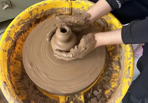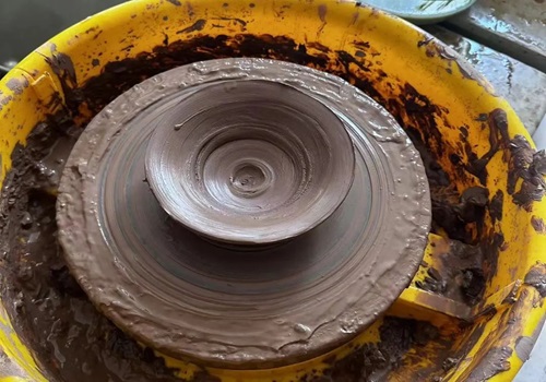 刘老师给每位志愿者发放了一块陶土,教给志愿者们如何进行简单的陶器制作。志愿者们跟着老师逐步地进行学习,她们不怕脏,不怕累,从容不迫地按照老师讲的方法进行着手里的动作,不停地将自己手中的陶块进行反复地揉、拉,最后在转盘不停地旋转下,手中的陶土渐渐成型。