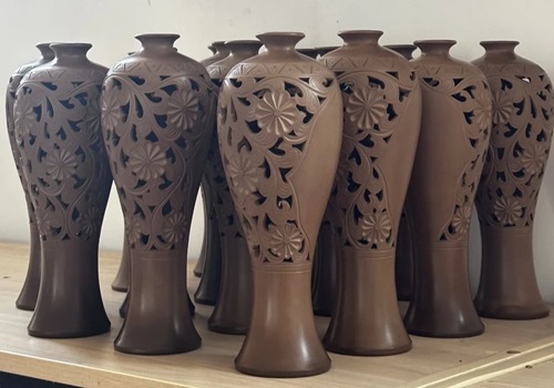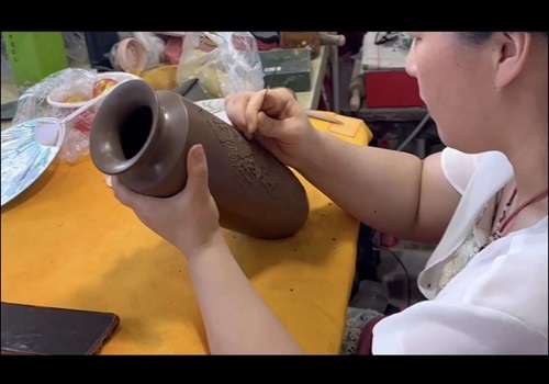 在传承人工作室内,各式各样的黑陶成品映入眼帘,每一件都栩栩如生,充满了生命力。刘老师进一步指出,雕刻黑陶上的花纹绝非一蹴而就,需要历经数年的磨练,这种十年如一日的坚持与对工艺的深厚情感,以及不可或缺的耐心,都是成就一件黑陶艺术品的重要因素。