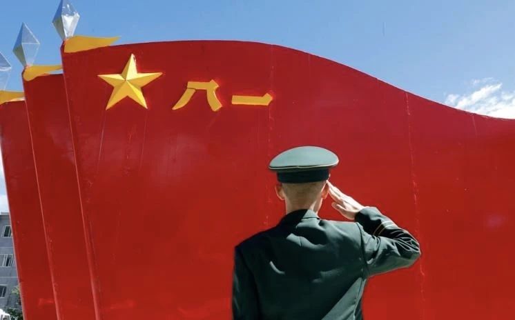 中国人民解放军军旗,图案为红底色,大五角星代表中国共产党,靠旗杆上方为金黄色五角星及“八一”两字,表示中国共产党打响南昌起义第一枪。自1927年8月1日南昌起义以来,经过长期奋斗,正以其灿烂的星光,普照着全国。