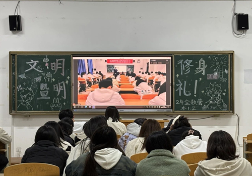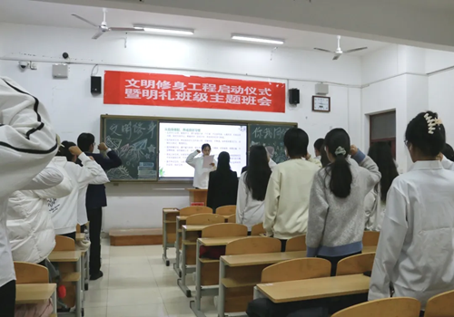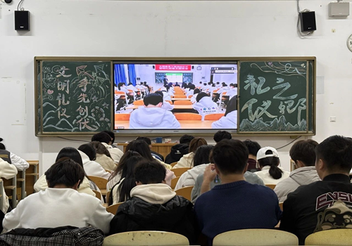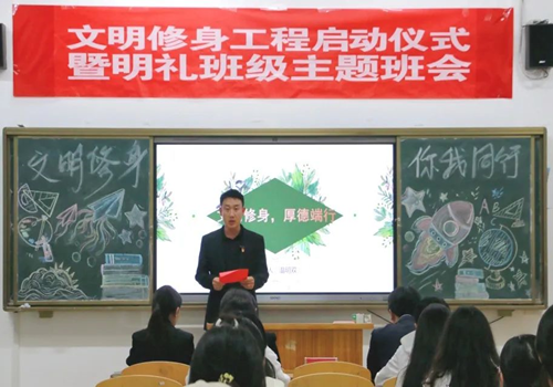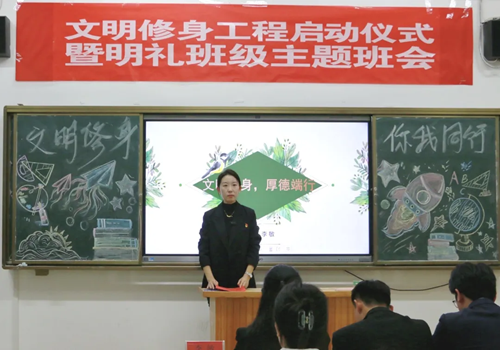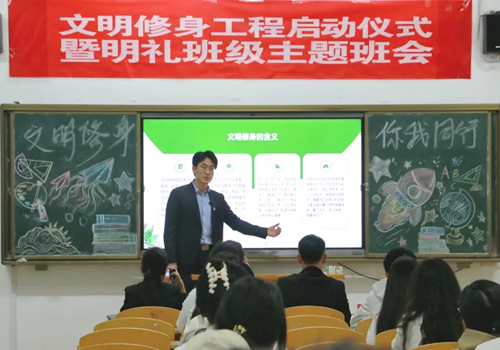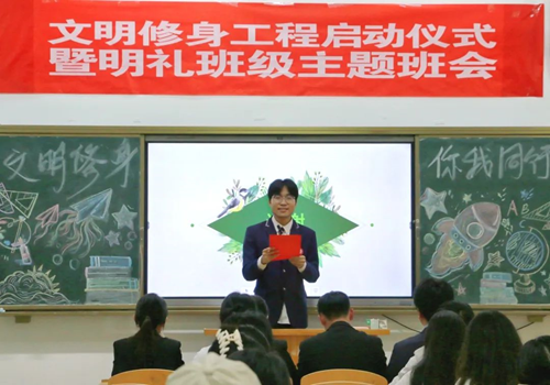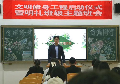 明礼班级作为文明修身的重要专项行动之一,强调师生关系的良好构建和优良班风的积极营造。为提升我院师生对于明礼班级的理解和实践动力,辅导员王威为全体师生带来“明礼班级主题班会”。首先他通过视频形式带领全体师生观看了明礼班级行为示范视频。其次,通过视频中生动的演绎,王老师进一步阐释了明礼班级的具体要求,倡导在每堂课开始前师生互礼,鼓励学生们主动承担课前准备责任,加深彼此间的尊重与理解,营造积极学风。他强调明礼班级的举措不仅能够有效提升课堂的效率,更重要的是能够在校园内营造出一种浓厚的尊师重教、团结奋进的文化氛围。通过这样的日常实践,同学们不仅能够学会感恩与回馈,同时也能够促进校园文化的健康发展。
