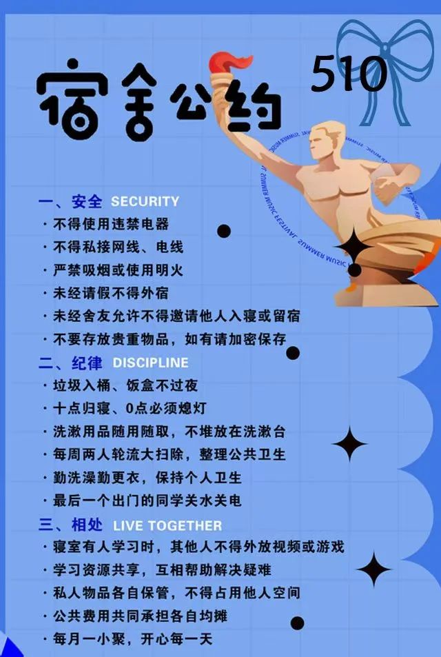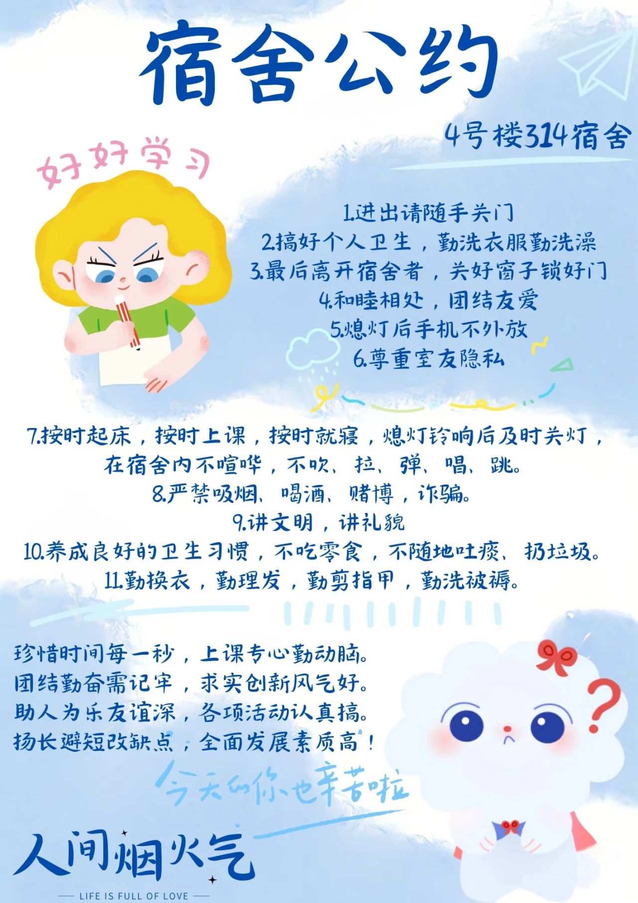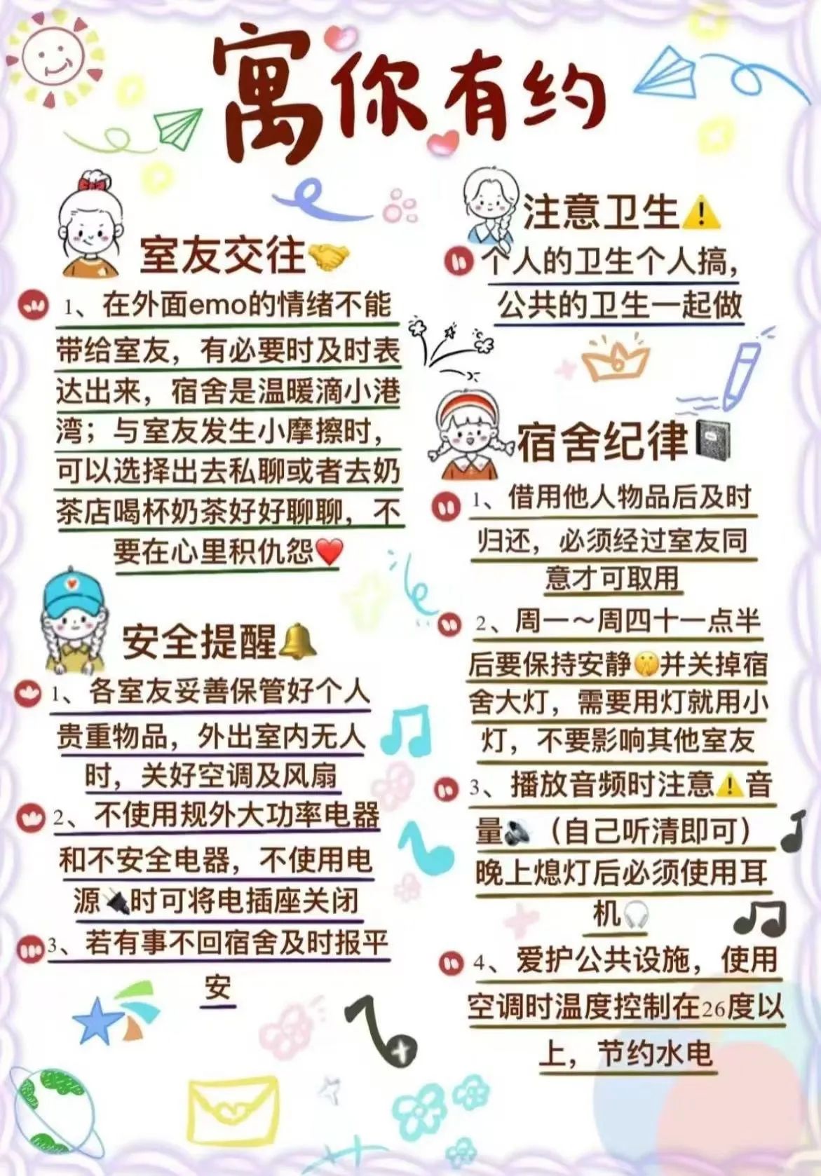 宿舍公约不仅仅是几条简单的规则,更是作为宿舍管理的重要规章制度载体,其制定离不开每位同学的积极参与。大家踊跃建言献策,发表个人见解,共同营造和谐的宿舍氛围,携手构建良好的宿舍生活秩序。