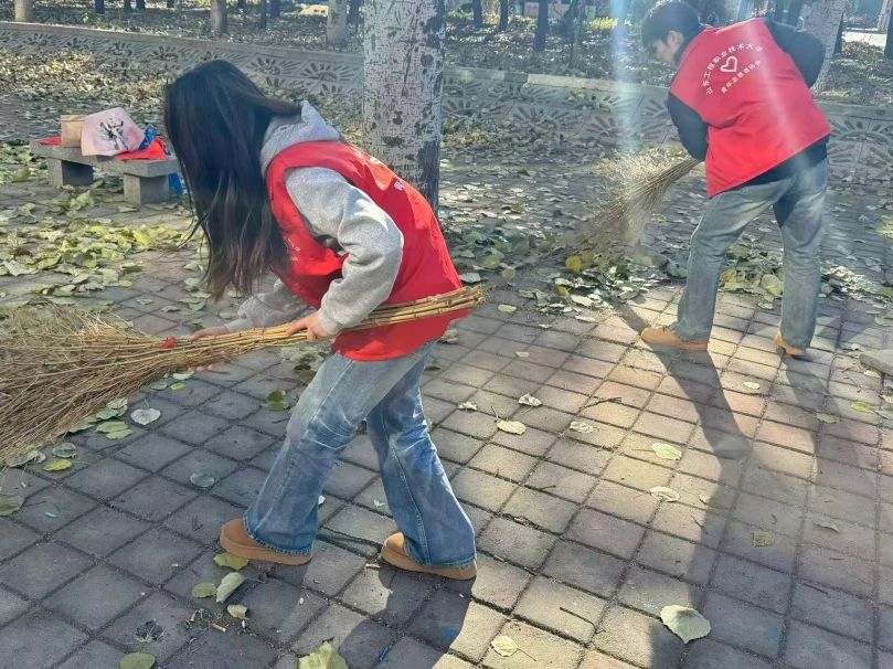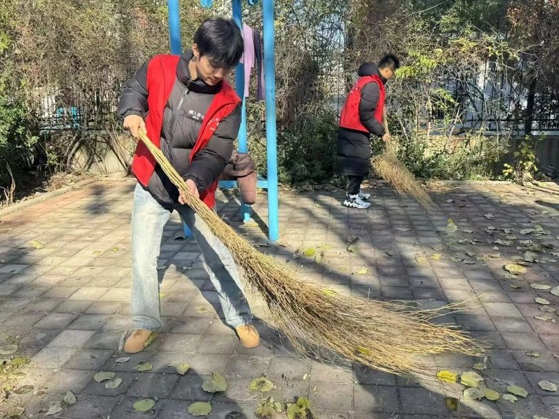 活动中,志愿者们热情高涨、干劲十足,手持大扫帚等卫生工具,分工明确、相互配合,认真地清扫着地面上的落叶。