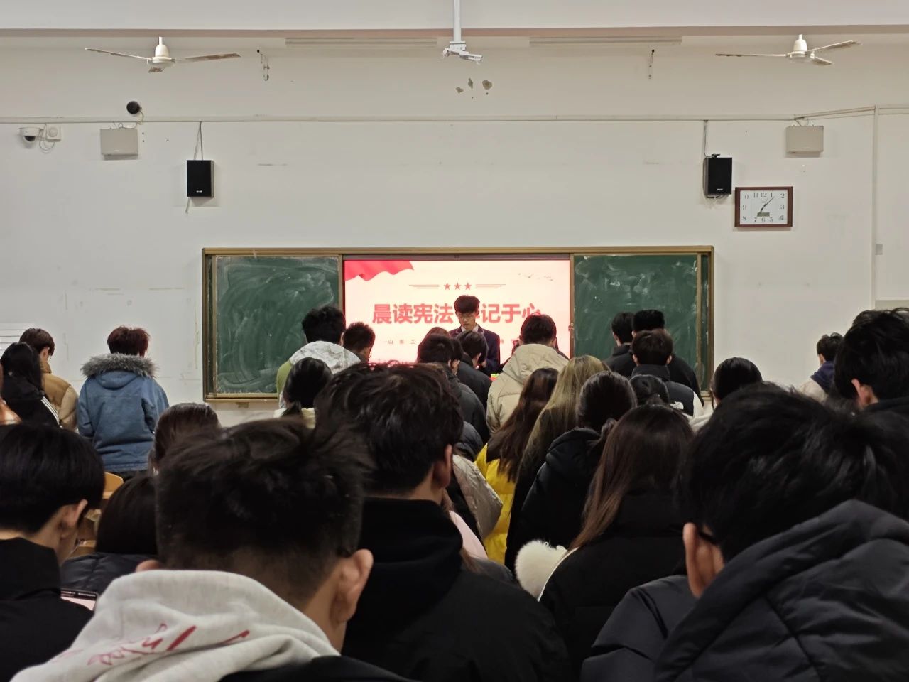 为深入贯彻习近平法治思想,增强学生法治观念,弘扬宪法精神,营造校园法治文化氛围。商学院于12月2日在诚基楼五楼各教室开展“与‘宪’同行,‘法’记于心”宪法晨读活动,商学院2024级同学参加了本次活动。