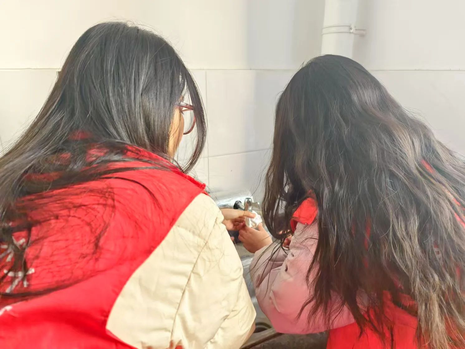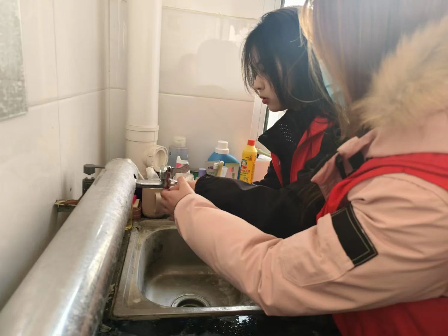 志愿者们以小组为单位,分别前往各个学生宿舍,积极开展志愿工作。先将水龙头仔细擦拭干净,将洗脸巾紧密地包裹在水龙头的表面,再用防水皮筋牢牢地缠绕固定,确保包裹得既紧密又无缝隙、不松动,以此组建起一个简易而有效的过滤层。