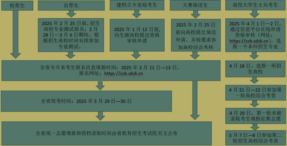 根据教育部有关通知精神,应征入伍地为山东省的退役大学生士兵(指普通专科毕业生及在校生应征入伍服兵役后退役,报名时为2025年应届专科毕业生或往届专科毕业生),可申请参加相关高校的退役大学生士兵免试专升本招生(不得兼报全省统一考试专升本)。符合条件的退役大学生士兵在线申请资格审核,经招生考试部门及退役军人事务部门审核并公示后,获得退役大学生士兵考生资格。退役大学生士兵考生须根据本人专科毕业专业和专业指导目录选报1个本科招生专业,一经确定不得更改。