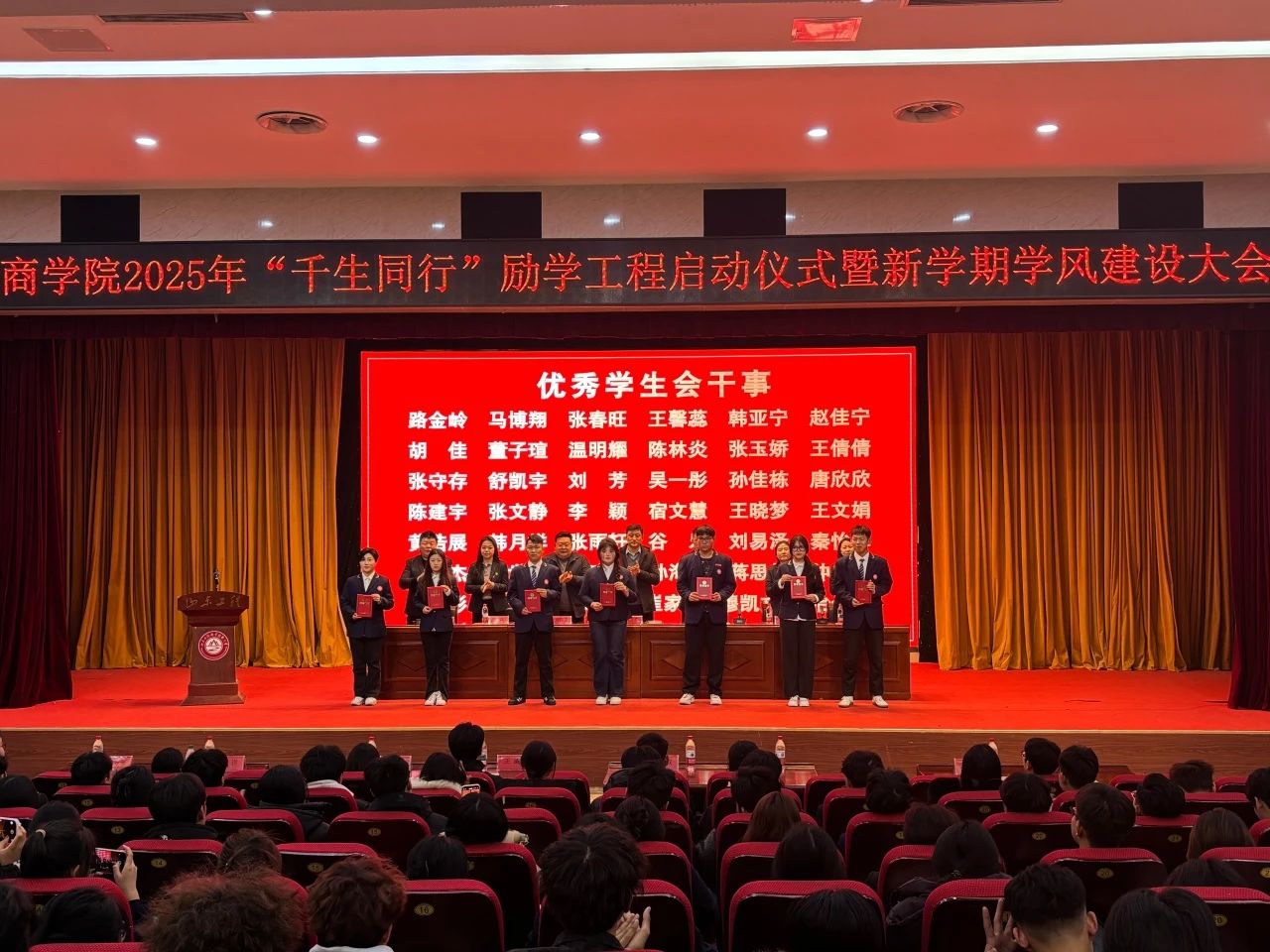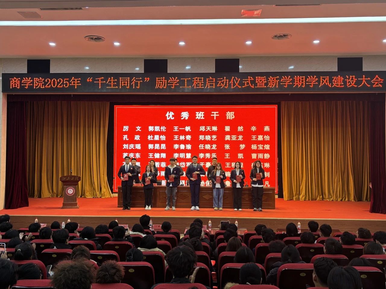 随后,学生干事李敏宣读了《商学院2025年“千生同行”励学工程实施方案》。该工程以课堂为根基、以学术为纽带、以发展为导向,旨在通过构建“师生-朋辈-校企”三维协同机制,打造优良学风生态。方案提出了八项专项行动,包括课堂引领行动、制度引领规范、自主引领承诺、文明引领风尚、习惯引领计划、互助引领帮扶、科创引领实践以及榜样引领力量,每一项行动都旨在激发学生的内在动力,助力学生成长成才。