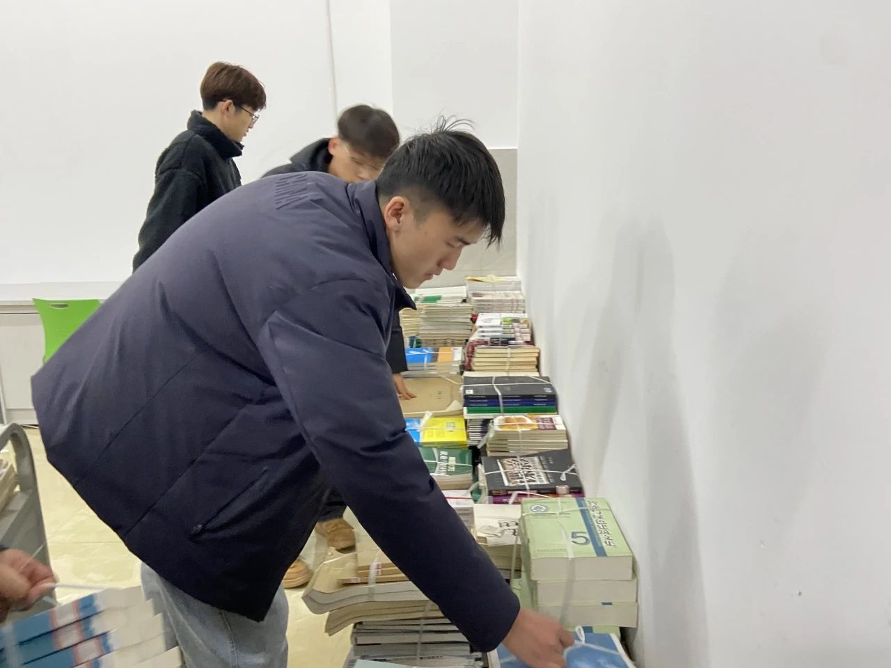 到达教室后,志愿者们即刻投入到紧张而有序的工作中,他们分工明确,配合默契,拿起地上摆放的书籍,仔细核对数量,确保无一遗漏。随后,这些书籍被稳妥地放置在小推车上,志愿者们还根据书籍的类别和原有顺序进行了细致排列,此举极大地提升了后续搬运工作的效率与便捷性,为后续流程的顺畅进行奠定了基础。
