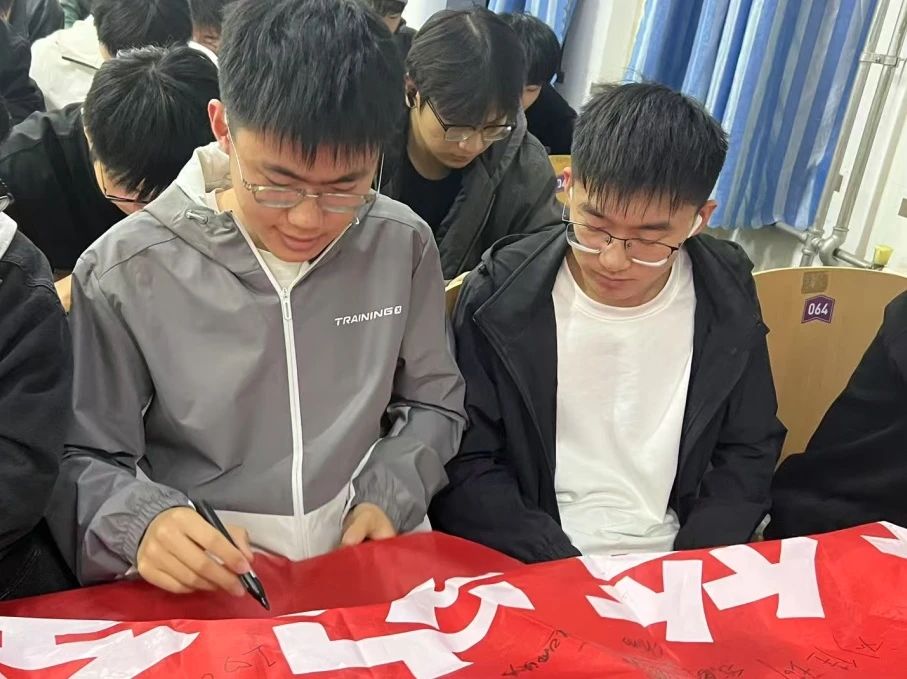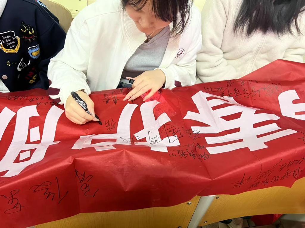 全民国家安全教育日主题宣讲活动末尾,举行“共筑安全防线,青春护航家国”横幅签署仪式。横幅在教室中依次传递,同学们纷纷签下自己的名字,以实际行动许下守护国家安全的诺言,彰显坚定决心。