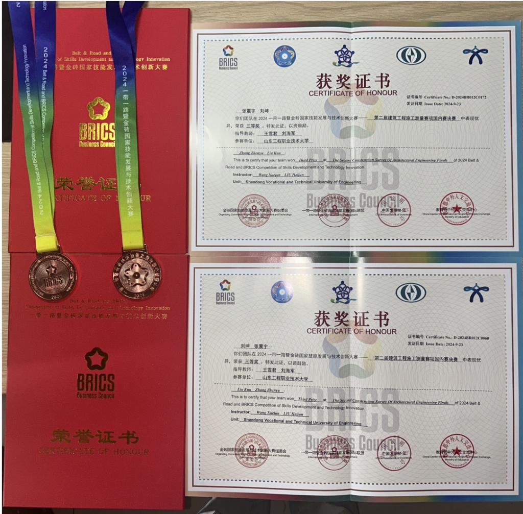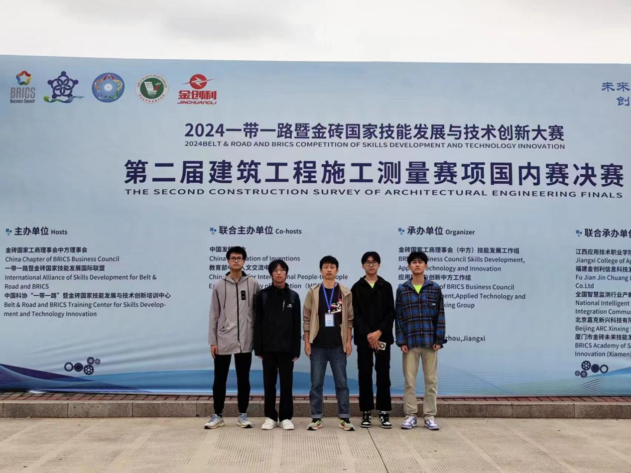 近日,2024一带一路暨金砖国家技能发展与技术创新大赛之建筑工程施工测量赛项(高职组)国内决赛在江西应用技术职业学院举办。经过激烈角逐,建筑工程学院张震宇、刘坤同学进入决赛,最终荣获国家三等奖。