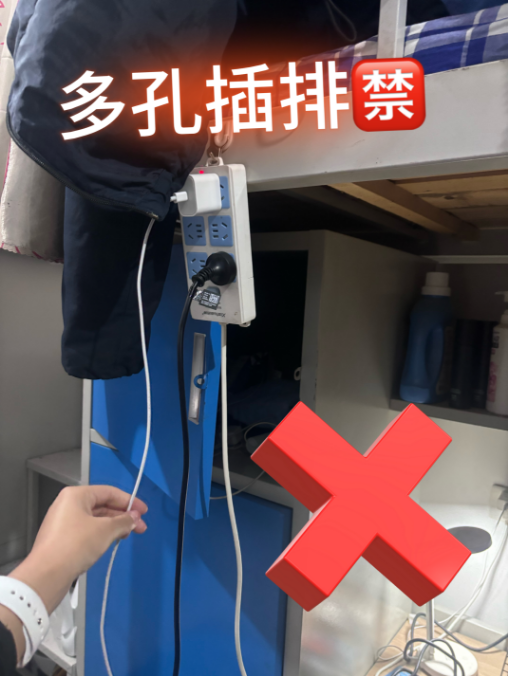 大功率电器在宿舍使用易致电线过载,引发火灾,务必远离;多孔插排不合理使用,易短路起火;插电卷发棒有火灾隐患,请勿使用。