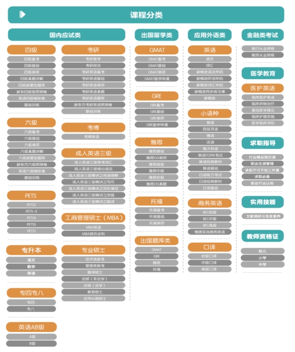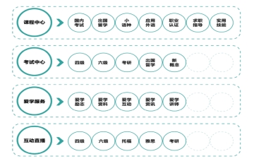 为满足不同用户的需求,新东方自主研发上百种产品,满足应用外语、职业认证、实用技能、学历提升、职场晋升等需求。同时将平台划分成:课程中心、考试中心、爱学服务和互动直播。