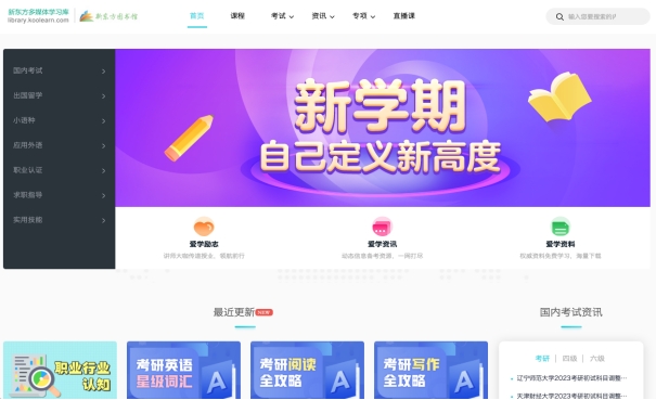 新东方多媒体学习库(library.koolearn.com)是由新东方在线组织精英教师团队和优秀技术人员倾力打造的多媒体在线教育培训平台。依托于新东方强大的师资阵容和制作团队,新东方多媒体学习库向广大高校师生提供了丰富、实用的新东方原汁原味培训课程,内容涵盖国内考试、应用外语、出国考试、实用技能、大学生求职和职业认证与考试等6大类,让高校师生足不出校便能尽享新东方激情、幽默教学风格的魅力,获得卓越的在线互动式学习体验,是高校师生考试、出国、充电、求职的首选学习资源。