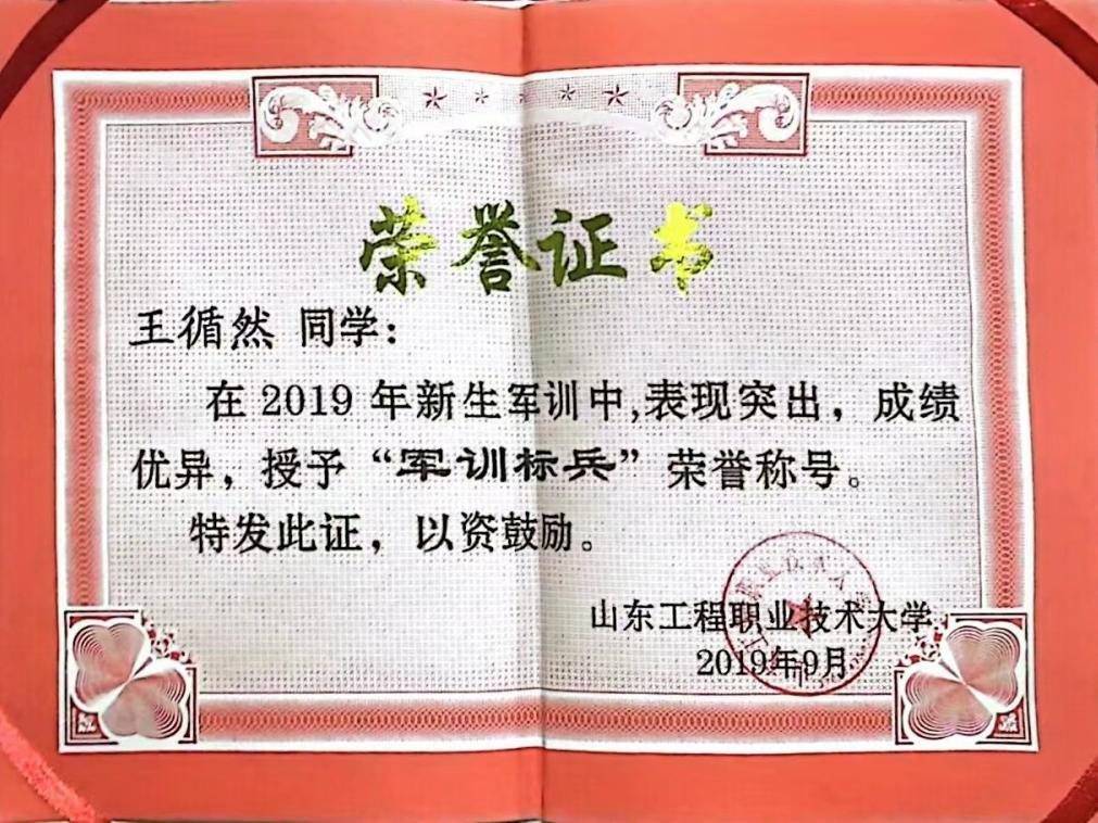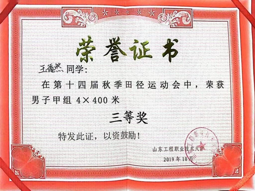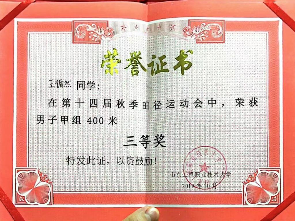 a2019年9月,是他步入山东工程职业技术大学的第一年。炎炎夏日中,少年意气风发,他在新生军训中表现突出,荣获“军训标兵”称号。他以严格的军训标准要求自己,以认真的心态对待军事训练,获得教官和老师们的一致认可。同年十月,我校举办第十四届秋季田径运动会,他积极参加了男子甲组400米、4×100米以及男子甲组三级跳远并都荣获三等奖。汗水洒在跑道上,浇灌着他健全的人格和强健的体质,成为一名全面发展的大学生。
