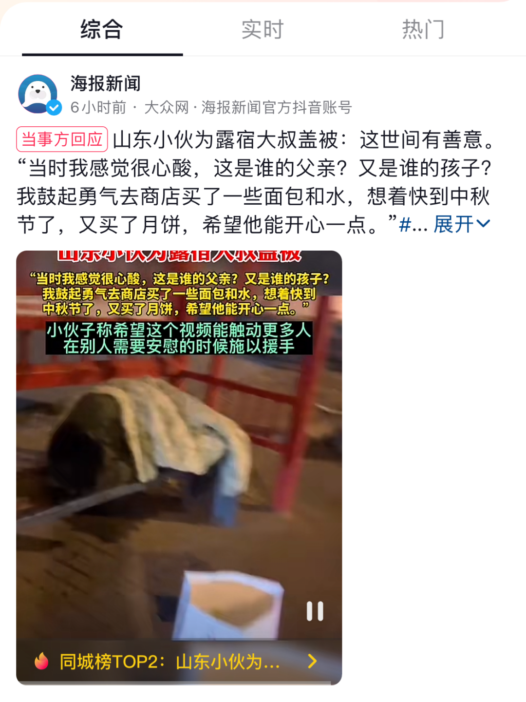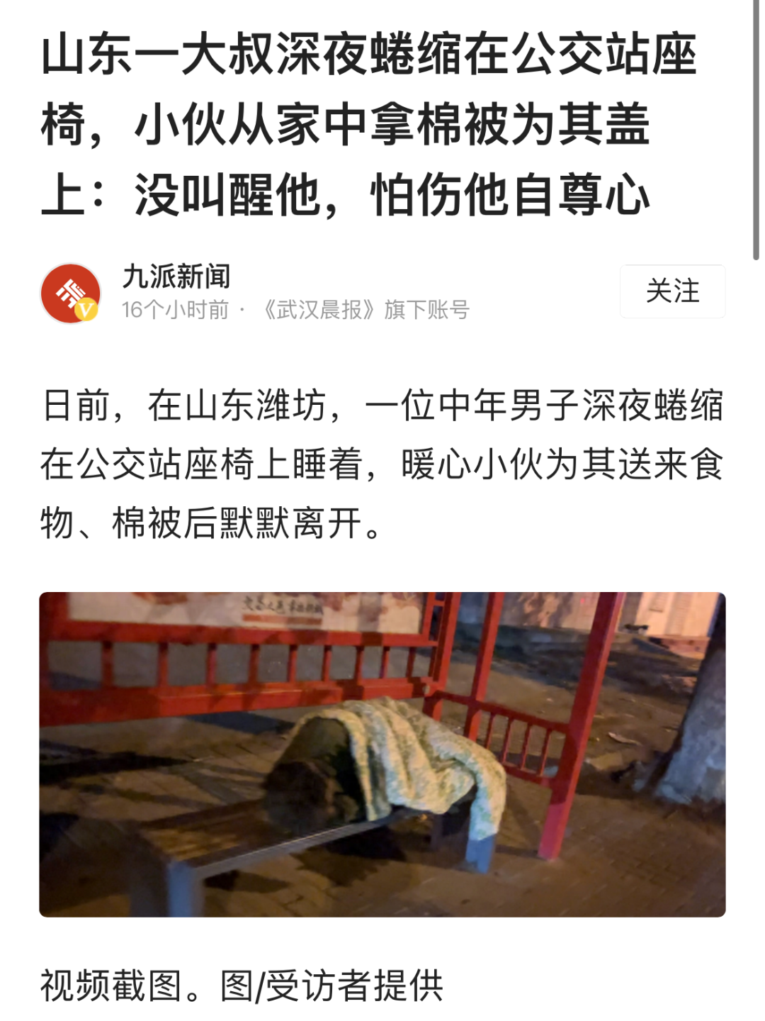 a近日,我们电话联系到了这条视频的记录者,他是今年6月份刚毕业于我校智能制造学院的学生王循然。他向我们分享道:当时是在回家的路上遇到的那位大叔,只见他衣衫褴褛蜷缩在公交站牌的座位上,我心里受到了很大的触动,甚至泛红了眼眶,于是我鼓起勇气去了最近的便利店买了食物和水,想着马上要中秋了,或许这提月饼能够带给他一丝慰藉,立秋的夜晚总归是有几丝寒意,我又回家拿了一床被子为他盖上。我轻轻拍了拍他,本想递给他食物与水,但想想还是算了吧,他醒了之后我不知道该怎样面对他,才能不让他的自尊心受到伤害,我不知道他是谁的父亲,又是谁的孩子,也不知道他经历了什么,只想在此刻为饱经风霜的他带来几丝温暖。