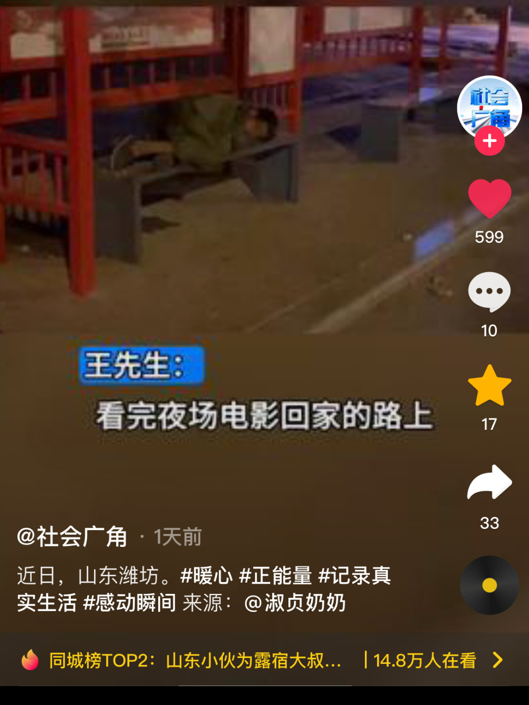 这是举手之劳的小事,我们每个人都会有这种善意,只不过有时基于当时环境无法实现,希望这条视频可以触动更多的学弟学妹在我们力所能及的情况下,给更多的人带去光亮,同时将爱心传递下去。”王循然感慨到。我们生活在光亮里,并不代表这个世界都是光亮的。少年暖心举动的背后不仅展现了大学生的社会责任心与公德心,同时也是大爱的真情流露,照亮了露宿大叔前行的路,带给了他光亮与温柔,希望我们都不要丢掉善良与真诚,带着光亮继续前行。