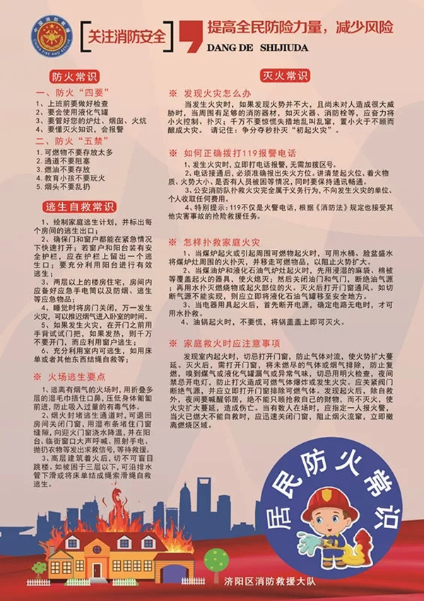 为深刻汲取火灾事故教训,提高广大人民群众的消防安全意识和火灾自防自救能力,按照总队的部署要求,济南支队自主设计《社区、家庭消防安全明白纸》、《居民用电消防常识明白纸》、《校园消防安全常识》等宣传彩页并组织宣传人员深入全市九小场所、小餐饮场所,开展“入户式”消防安全宣传工作,营造良好的春季校园消防宣传氛围。