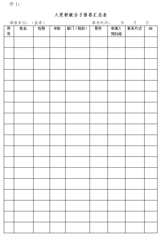 2.请各党总支于5月17日(周一)下午16:00之前将入党积极分子党校培训名单汇总表(附1)和党校入党积极分子培训档案(附2)纸质版加盖公章交至党委组织统战部,电子版发送至校组织统战部邮箱sdgczzb@163.com并发送思政部邮箱418270408@QQ.com存档。