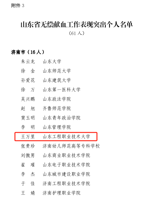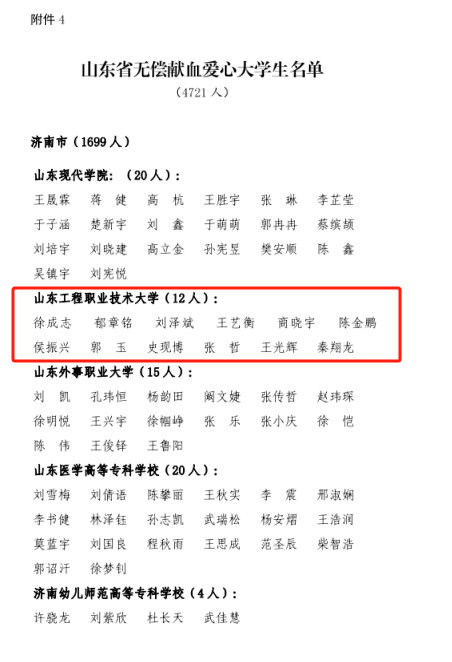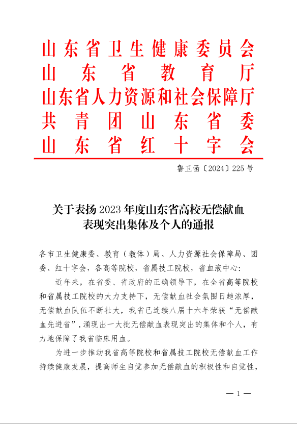 近日,山东省卫生健康委员会、山东省教育厅、山东省人力资源和社会保障厅、共青团山东省委及山东省红十字会联合印发《关于表扬2023年度山东省高校无偿献血表现突出集体和个人的通报》,我校荣获“山东省无偿献血组织表现突出学校”称号,青年志愿者协会荣获“山东省无偿献血志愿服务表现突出集体”称号,学生工作处(团委)王万里荣获“山东省无偿献血工作表现突出个人”,12名同学荣获“山东省无偿献血爱心大学生”。